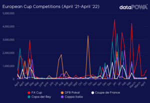 To get a handle on the popularity of Cups in the modern football landscape, sports data experts DataPOWA have looked at the number of global internet searches over the last 12 months (April ’21 – April ’22) for the five biggest Cup competitions in Europe: