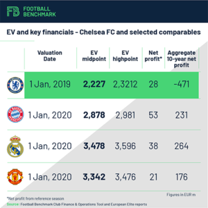 Football Benchmark have undertaken the estimation of the Enterprise Value (EV) of the most prominent football clubs in Europe since 2016. The table below summarizes some key financial information about Chelsea FC and three selected comparable clubs from their most successful financial years in this period.